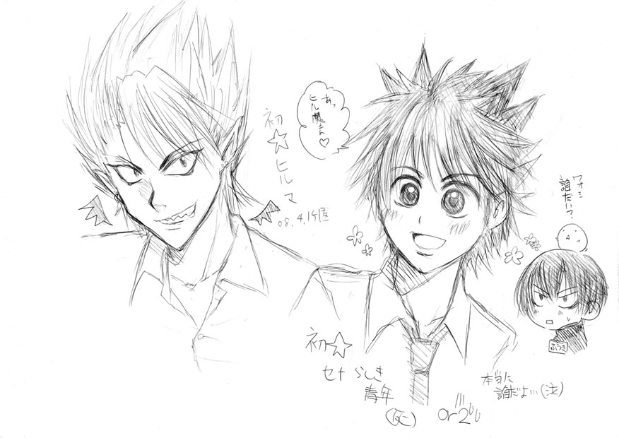 あれですね、他のサイトに自分の描いた絵が載せられてるって想像以上に恥ずかしいですね! ちょっとした羞恥プレイだよ(笑) けどちょっと嬉しい。 俺も貰った絵は載せさせて貰ってるけどね! ただ一つ、しーさんに貰った物凄く可愛くて綺麗なサモナイのイラストだけは載せてない。 許可を貰ってないのと、文字が入ってるから許可を貰いに行くのもちょっと躊躇ってて…。 けど何度見ても綺麗なんだよっ!! どうやったらあんな風に描けるのか、あんな風に塗れるのかっ! 一人で眺めてにやけてます(怪) いもむしさんに歪みの国のアリスを散々薦められたのですが…あれ、人気高いですよねー。 管理人の藍瑠も確かやっていたと思いますが……俺ホラー駄目なんです。 アリスとかの画像を見せてもらったけど、画像が綺麗過ぎてリアルで怖い(笑) まずムードが怖い。 そしてアリスの話をちゃんと知らない(どうでもいい) だからする気になれないんだよ、ごめんね、いもむしさん。 現在、目指せ最近の流行おしゃれを!!をテーマに(え)しております。 はい、意味が分からないですね。 ただ服をいつも着ているようなカジュアル(地味の方が合ってるかも)ではなく、ちょっとでもおしゃれをしようと思っています! ……今更どうした?と言った感じなんですけど…実際着てみないと描けないんだよっ!! 雑誌とか見るのも良しだけど、やっぱり自分の普段着るものが描きやすいと思った。 と、言うことで本日服を買いに行きました。 さすがにひらひらは買わなかったけど…重ね着用の服を二枚程……。 正直な所あまりおしゃれと言った感じではないと思います。 俺にとっては黄色とか買った時点で大いなる進歩なんだよっ!!(普段どれだけイモいんだよ) 他にはGパンとかも買いましたけど…正直な所、俺は服にお金をかける奴ではなかったので一万超えたのは初めてです(超えたかな?) あと少し早いけど母の日用にと枕を買いました。 母親が枕を欲しいと言っていたので…低反発のやつを。 出費がなかなか…けど前までは買い物行く暇があまりなかったからいい機会です。 次に描く話…ちょっと難しいかもしれないぞこんちくしょう。 また会話だけだねって言われそう。 いもむしさんから頂いたヒルセナー!! しかもいもむしさん、ヒル魔さんもセナ君も初描きですよ!? 東京のホテルで俺の携帯にあるヒル魔さんとセナ君の写メを見ながらえっちらほっちら描いてくれました! ありがとーっ!! 可愛いぜーっ!! セナ君の髪が分からないと散々嘆いておられました(笑) 宝物部屋…今はないけどもし作ることがあったらそっちに載せさせてもらいます。 ほら、殆ど貰うものないので作っても空しいかなーって…。 …他のサイト様からフリーイラストとか小説とかはこっそり貰っちゃったりしてるけど(え) 今日、やっと前に描いていた絵の色塗りをしました。 一ヶ月以上前に描いた線画…「これ、腰の部分おかしい。胴と足が繋がってないよ」と言う絵になってます。 ま、それは完全に俺の力量不足です。 今更ですけど。 ヒルセナなんですけどね、明日にでもアップ出来たらなーと思ってます。 夢の方は更新できるけど、BLの方がなかなか更新できないので早めにアップしたい。 さて、新しい話を考えないと! DSのサモナイ発売日…よく見たらあと一週間切ってるんだ! 都心から帰ってきました~! まぁ帰ってきたのは昨日ですが。 結果は惨敗…予想通りです(笑) けど最後の人とは色々と漫画の話とかフェチの話(笑)とかしてて楽しかった。 ただ一時間以上話していて…友達を待たせてしまった、ごめんよ。 さて、そんなつまらない話はさておき、先輩から頂いたイラストを載せましたー!! ヒルセナ可愛いーv 文字が書いてあったのでそこは消させていただいたのですが…これ、ヒル魔さんが俺に「頑張れ!」って言ってくれてるんですっ!! ヒル魔さんが、ヒル魔さんが俺にぃーっ!! ついでに言えば先輩は絵描きでもないんです。 なのにこんなに可愛い絵をっ!! 鼻血出る…出ちゃうよーっ!! 昨日いもむしさんからもヒルセナイラストを描いてもらったので、まら後日載せさせてもらいます! まだスキャンしてないからね。 あ、勿論二人からは掲載許可貰ってますので! さて、昨日知った事実…今週のWJ、アイシが巻頭カラーじゃんか!! 最近外へ出ていなかったので知らなかったんです。 遅くなったけど買いました! と、言うことで今日は木曜日だけど感想をば。